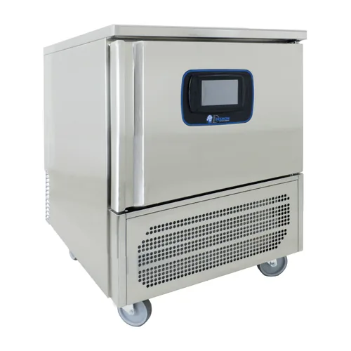 Capacidade: 5 GN 1/1. Carga máxima: 20 kg (resfriamento) / 12 kg (congelamento). Temperatura de trabalho: +3°C (resfriamento) / -18°C (congelamento). Potência: 1.380 W. Dimensões: 800 × 805 × 850mm. Voltagem: 230V monofásico. Controles digitais touchscreen com suporte HACCP. Isolamento 60mm (CFC/HCFC-free). Degelo automático por gás quente. Construção em aço inoxidável AISI 304. Garantia de 1 ano do fabricante.