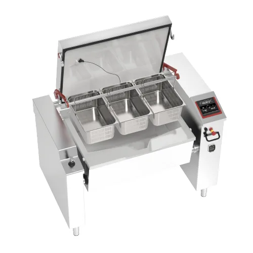 A cocção pressurizada a 0,45 bar eleva o ponto de ebulição da água para 110°C, acelerando a transferência de calor para o alimento. Braziados que levam 3 horas em panela convencional ficam prontos em menos de 1 hora. Ideal para proteínas de cocção longa (paleta, mocotó, feijão, lentilha) em refeitórios com horários de refeição fixos.