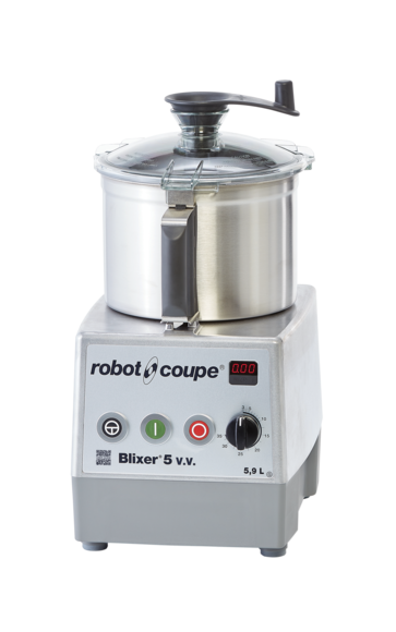 O Robot Coupe Blixer® 5 é o mixer-cúter profissional de médio porte da linha Blixer® — projetado para operações que processam entre 50 e 100 cobertas por serviço. Com cuba de 5,9 litros em aço inox e motor assíncrono de 1.500 W de transmissão direta (sem correias), processa sopas, purês, molhos emulsionados, patês e preparações de textura modificada com consistência e velocidade repetível. Está disponível em duas configurações: Blixer® 5 V.V. (velocidade variável, monofásico 220 V) e Blixer® 5 – 2V (duas velocidades fixas, trifásico) — a escolha depende da instalação elétrica e do nível de controle necessário sobre a textura final.
