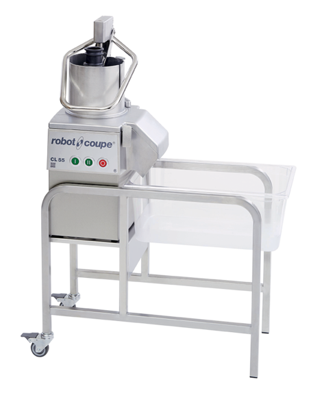 O Robot Coupe CL 55 é a família de processadores contínuos de piso para cozinhas de 300 a 1.200 refeições por dia. Com motor de 1.100 W, vazão de 400 kg/h e estrutura sobre stand em aço inoxidável com rodas e freio, libera a bancada e centraliza o pré-preparo em uma estação de alto desempenho. A família CL 55 oferece três configurações — Alavanca, 2 Bocas e Workstation — adequadas a diferentes perfis de operação e volume.