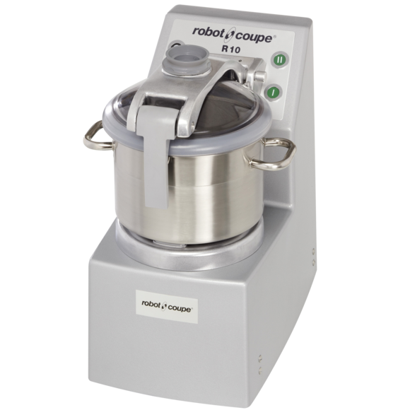 O Robot Coupe R 10 é o maior cúter de bancada da linha R, com cuba de 11,5 L e motor trifásico de 2.600 W. Projetado para operações entre 200 e 300 cobertas com alta demanda de processamento em cuba, é a solução para cozinhas centrais, catering industrial, restaurantes de grande porte e operações de food service que precisam de alta capacidade sem instalar um cúter de piso. Três facas posicionadas próximas ao fundo da cuba garantem processamento homogêneo mesmo com cargas elevadas — mousse de atum, patê de fígado, emulsões de alto volume, sopas trituradas.